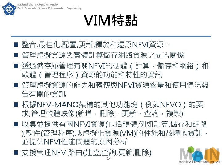 National Chung Cheng University Dept. Computer Science & Information Engineering VIM n VIM負責控制和管理計算, 儲存和網路資源 n 通常放在single infrastructure domain n VIM扮演各種監督者和屬於NFVI的網路控制者, 實現NFVMANO架構的其他功能塊公開的功能 13