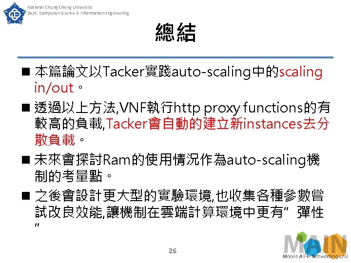 National Chung Cheng University Dept. Computer Science & Information Engineering 實驗結果 n 創立新VNF後, instance 1 和2的CPU使用率 分散到三個Instances 25