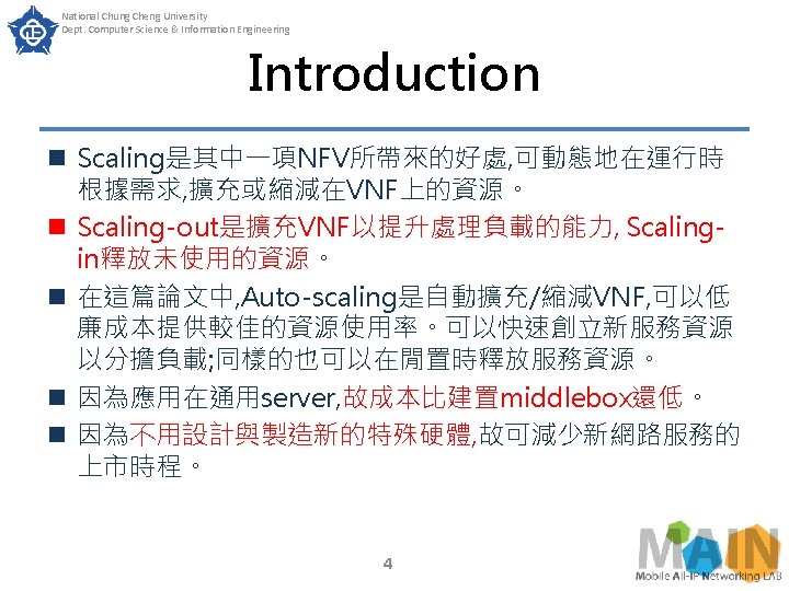 National Chung Cheng University Dept. Computer Science & Information Engineering Introduction n 也因為所有服務都是一樣的操作流程, 不需 要雇用部各種專業人員去管理各種 middlebox, 故可以減少營運成本。 n 在所有的NFV-MANO(Management and Orchestration)的實作方案中, Tacker是其 中一個符合規格且能提供最多功能的。 n 本篇論文以Tacker實作auto-scaling。 5