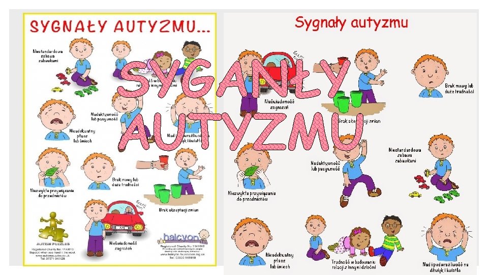 Co to jest autyzm i kto na niego choruje? ◦ Autyzm może występować u dzieci i u dorosłych, ◦ NIEULECZALNA CHOROBA ◦ Autyzm jest całościowym zaburzeniem rozwojowym, który daje objawy najczęściej do trzeciego roku życia dziecka. Chorobę można opisać jako wycofanie z życia społecznego, stąd słowo „autyzm”, które pochodzi od greckiego „autos”, co oznacza „sam”. • Zaburzenia ze spektrum autyzmu to AUTYZM WCZESNODZIECIĘCY autyzm wysokofunkcjonujący AUTYZM ATYPOWY ZESPÓŁ ASPERGERA upośledzenie zdolności niewerbalnego uczenia się całościowe zaburzenie rozwoju