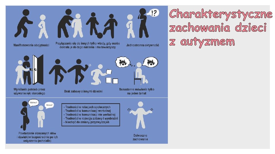 ◦ 1. Defekt społeczny: to brak zdolności do nawiązywania wzajemnych relacji z drugą osobą. Jest on powszechnym symptomem autyzmu. Przejawia się w trzech typach zachowań „zamknięty w sobie, bierny i dziwny”. Do nieprawidłowości w sferze interakcji społecznych zalicza się: brak kontaktu wzrokowego, zaburzoną mimikę twarzy, niedostateczny rozwój związków rówieśniczych, brak odwzajemnienia społeczno emocjonalnego oraz spontanicznej potrzeby dzielenia się z innymi ludźmi własnymi zainteresowaniami ale też radością i smutkiem. ◦ 2. Defekt w komunikacji werbalnej i niewerbalnej: oznacza nieprawidłowy rozwój w zakresie rozumienia i ekspresji językowej, która służy do komunikowania się z innymi ludźmi. Nieprawidłowości w porozumiewaniu się mogą przybrać opóźnienie lub brak mowy werbalnej. Jednocześnie występuje kompensacja za pomocą gestów lub mimiki. Możemy mieć tez do czynienia z brakiem inicjatywy oraz małą wytrwałością w podtrzymywaniu konwersacji a wręcz stereotypowym, powtarzającym się wykorzystywaniem słów lub całych zwrotów oraz brakiem lub upośledzeniem zabawy spontanicznej. Zaburzenie to występuje w różnych stopniach nasilenia, przede wszystkim pojawia się w formie: braku wszelkiej chęci komunikowania się z innymi, echolalii i ciągłego powtarzania, komunikacji ograniczającej się do wyrażania potrzeb, nieadekwatnych do sytuacji wypowiedzi, nieprzestrzegania reguł językowych.
