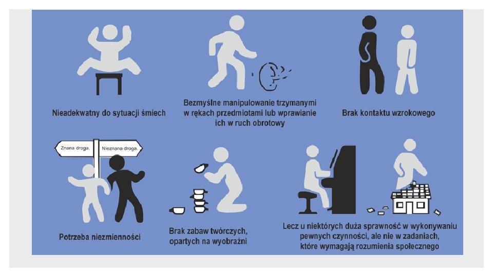 3. Defekt aktywności imaginacyjnej bądź tez powtarzające się, ograniczone wzorce zachowań: Ostatnia kategorię objawów stanowią wzorce zachowania, zainteresowań i aktywności o bardzo ograniczonym, powtarzającym się i stereotypowy charakterze. Do tego typu zachowań zaliczyć możemy nadmierne przywiązanie się do rutynowych czynności, stereotypowe często powtarzalne manieryzmy ruchowe, które dotyczą ruchów rąk bądź tez całego ciała a także skupianie uwagi na właściwościach przedmiotów, które są niefunkcjonalne.