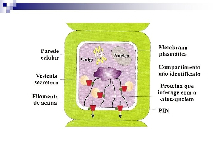 n Proteínas PIN não são fixas na membrana. n São transportadas para compartimentos celulares. n Retornam à membrana quando necessárias. n Seu movimento é dirigido pelo citoesqueleto de actina. n Redistribuição lateral de PIN ocorre após estímulos luminosos ou de gravidade.