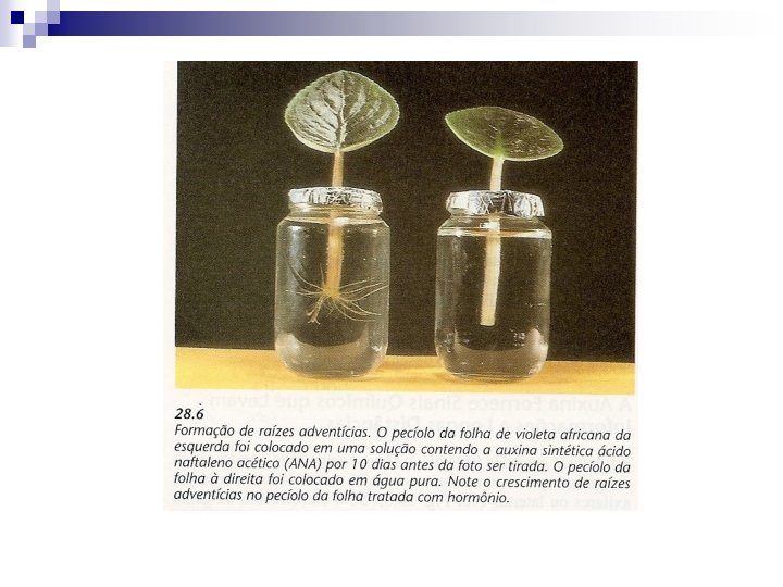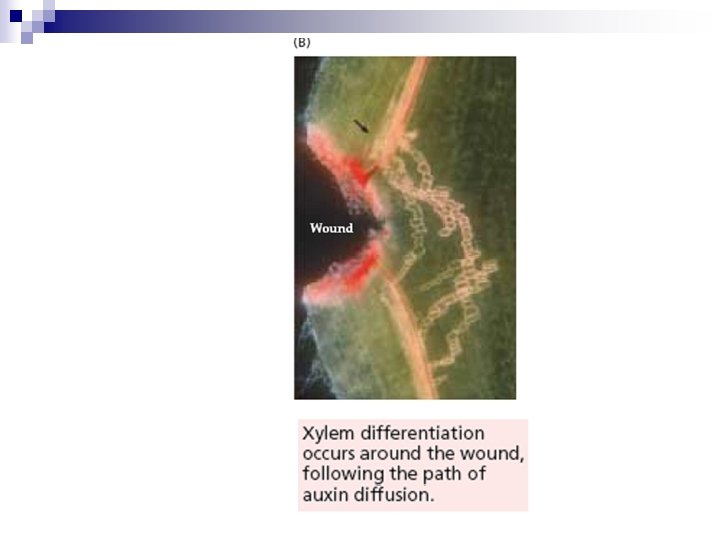 Diferenciação radicular e de tecidos vasculares n Auxinas podem ser transportadas dos meristemas apicais caulinares para raízes. n Ocorre também síntese de auxinas nos ápices de raízes. n Raízes laterais são formadas a partir de células do periciclo sensíveis às auxinas. n Primórdio radicular atravessa córtex e emerge pela epiderme. n Crescimento de raízes é estimulado em concentrações de 10 -10 a 10 -9 M de AIA e inibido em concentrações maiores. n Raízes adventícias formam-se em caules ou pecíolos devido ao estresse (via etileno), como por exemplo, alagamentos. n Células sofrem desdiferenciação. n Entram no ciclo celular, sofrem divisão e diferenciação com formação de um novo meristema radicular.