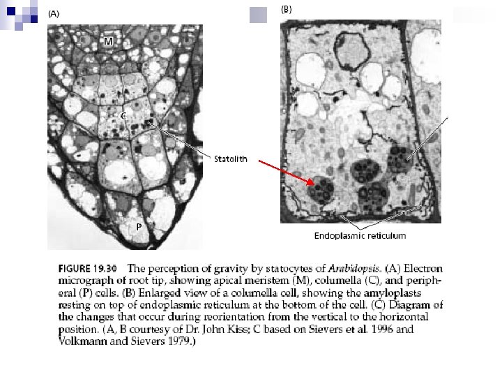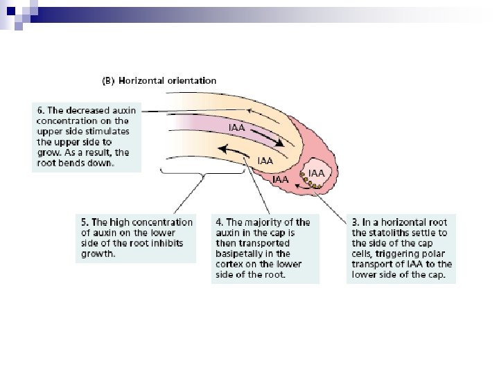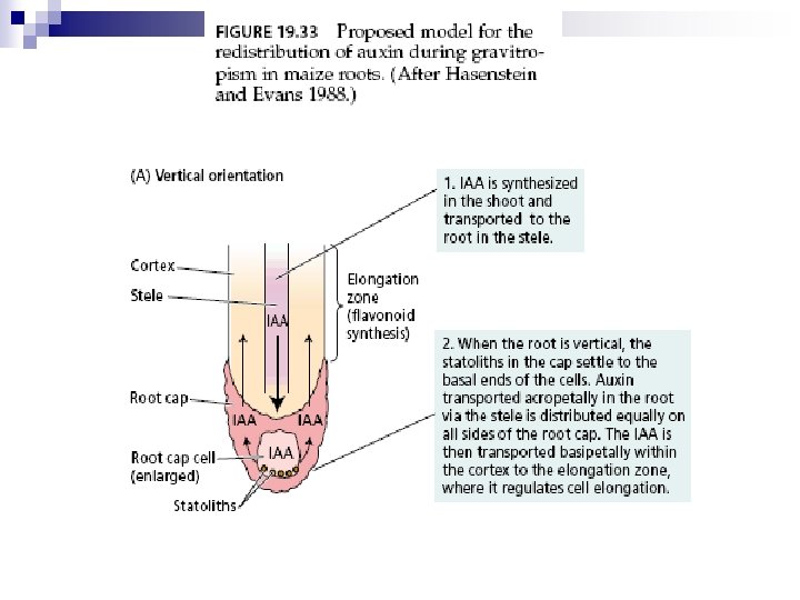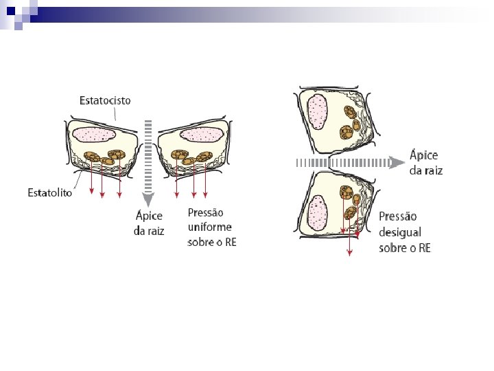 Teoria da tensogridade - integridade tensiva n Raízes possuem na coifa, células especiais, os estatocitos com estatolitos (grãos de amido móveis) que percebem a orientação gravitacional. n Sedimentação de estatolitos causa rompimento de citoesqueleto, mudança da tensão sobre RE, acúmulo de proteínas PIN 3 e canais de Ca 2+ na membrana. n Ocorrem alterações de atividades celulares. n Raízes crescendo verticalmente - PIN 3 tem distribuição uniforme nas células da columela e AIA também. n Partes aéreas (caules e ramos) – têm bainha de amido circundando tecidos vasculares, que se orienta conforme a gravidade.