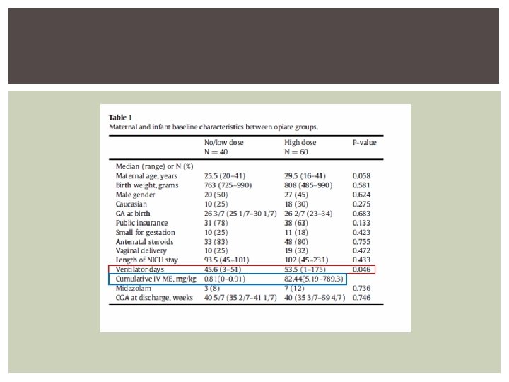 MÉTODOS Dados sobre o uso de opióides: § incluíram doses cumulativas de morfina ou fentanil § pacientes foram estratificados em 2 grupos: § dose baixa (< 1 mg/kg) ou nenhuma dose § dose alta Dados maternos, neonatais e sócio demográficos: § Idade materna no dia do parto, exposição a drogas, exposição a corticóide antenatal, tipo de parto e tipo de seguro de saúde (público ou privado). § Idade gestacional (IG), Peso ao nascer, genro, raça, se era pequeno para a idade gestacional (PIG), anormalidade ao ultrassom (US) transfontanelar, tratamento da persistência do canal arterial (PCA), enterocolite necrosante, sepse confirmada por cultura, exposição a ventilação mecânica, DISPLASIA BRONCOPULMONAR, exposição a corticÓide no período pós-natal, realização de procedimentos cirúrgicos e tempo de internação na UTIN.