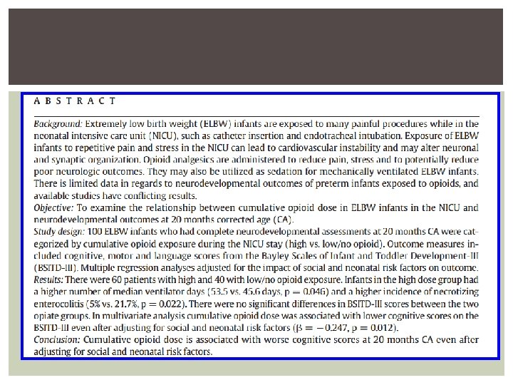 CONCLUSÕES Os resultados deste estudo identificou uma potencial associação entre dose cumulativa de opióides e escores cognitivos reduzidos com 20 meses de idade corrigida em um grupo de lactentes nascidos de extremo baixo peso contemporâneos. Esses achados persistiram após ajuste para fatores de risco social e neonatal. Com o aumento da sobrevivência de pacientes nascidos prematuros extremos, é vital uma melhor compreensão dos riscos e benefícios potenciais de uma exposição prolongada a opióides nesse grupo de risco. Mais estudos com acompanhamento mais prolongado são urgentemente necessários para avaliar o impacto dos opióides no neurodesenvolvimento de pré-termos expostos.