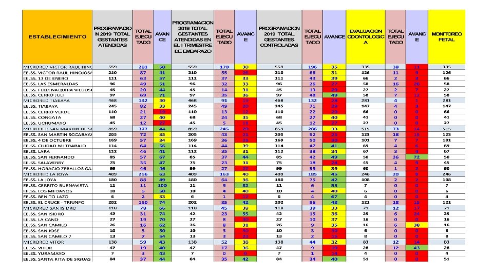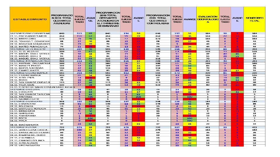 CONCLUSIONES 1. Manuales de codificación 2019 de materno y planificación familiar que recién enviaron a mediados del mes de mayo desde el nivel central, que retrasó la información, ya que los reporteadores no brindan la información por los cambios de códigos; esto nos dificulta la información a partir del mes de junio para adelante. 2. El nivel central no coordina entre estrategias para ver los problemas de la codificación y el mal registro en los ejemplos, ya que se hizo la observación y dijeron que mandarían una adenda, ya que al final del mes de junio nos volvieron enviar otro codificador de materno. 3. No logramos reenfocar a esas mismas gestantes porque muchas provienen de otros establecimientos del Minsa o son pacientes temporales de Essalud. 4. Se ha mejorado la atención a la gestante brindándoles los exámenes de la batería completa a todo nivel. 5. La cobertura de parejas protegidas es muy baja, esto por falta de seguimiento de las usuarias. 6. La atención de partos tiene regular cobertura de los partos en posición horizontal pero falta incrementar los partos en posición vertical. Es por ello que se está capacitando a las colegas en la atención de parto en posición vertical. 7. El control de las puérperas sigue siendo un problema porque no llegamos al segundo control postparto, esto por falta de seguimiento a las puérperas y porque no hay un buen seguimiento de las Contrareferencias.