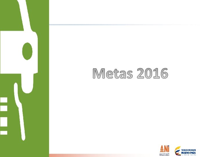 Proyecto TRANSVERSAL DEL SISGA Metas • Plan de Adquisición Predial • Plan de obras • Aprobación Estudios de Trazado y Diseño Geométrico • Aprobación Estudios de Detalle de las 4 Unidades Funcionales del Proyecto. • Mantenimiento y operación de la vía existente • Cierre Financiero • Inicio construcción de la obra Avances • Plan de Adquisición Predial – En revisión por Interventoría • Plan de obras - En revisión por Interventoría y ANI • Aprobación Estudios de Trazado y Diseño Geométrico – En revisión • Aprobación Estudios de Detalle de las 4 Unidades Funcionales del Proyecto. – En revisión • Mantenimiento y operación de la vía existente – En ejecución • Cierre Financiero – 13 -jul-2016 • Inicio construcción de la obra – 28 -ago-2016