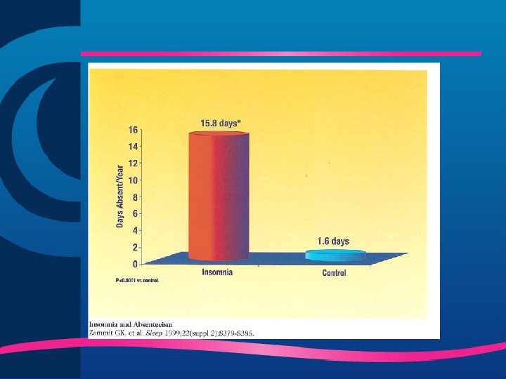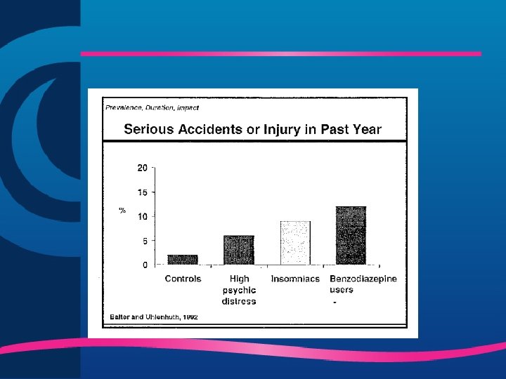 Conseqüências da Insônia Crônica ü Maior incidência de problemas de saúde ü Maior utilização de serviços médicos ü Maior utilização de medicamentos em geral ü Maior taxa de absenteísmo ü Menor desempenho nas tarefas profissionais ü Dificuldade de concentração, atenção ü Fadiga crônica ü Maior risco de acidentes ü Redução da qualidade de vida ü Irritabilidade ü Sintomas de depressão Benca, 2001; Hajak, 2001; Leger et al, 2002; Chevalier et al, 1999