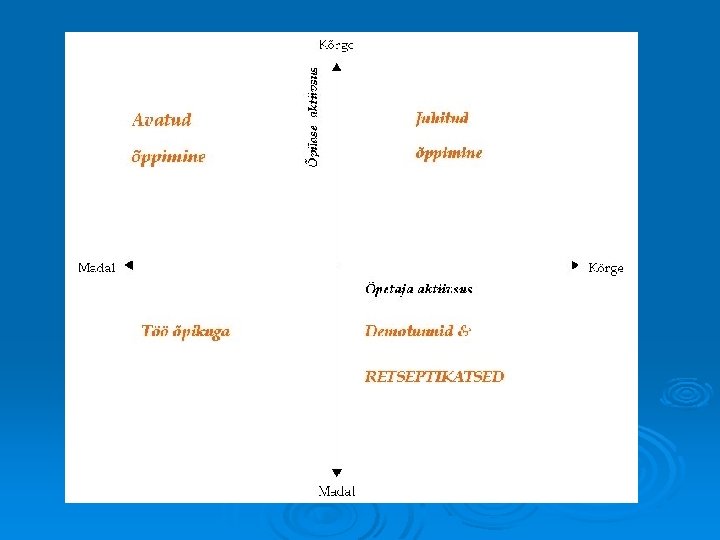 Avastusõpe. Uurimusõpe. Probleemõpe. Süsteemselt väljatöötatud õppevahendid Õpetajate kvalifikatsioon tvapärasest erinevaks rolliks Süsteemne ja asjalik täiendkoolitus