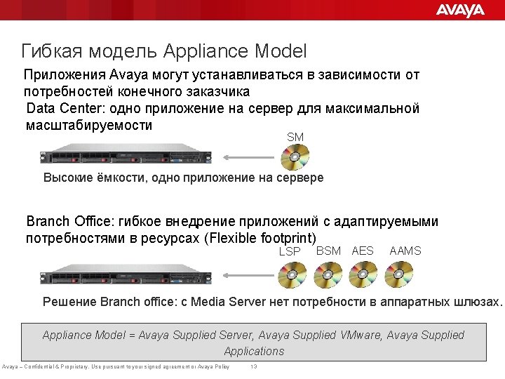 Варианты виртуализации Avaya Aura® 7. 0 Avaya Supplied Server Customer Supplied Server Virtualized Environment Customer Supplied Server and VMware Collaboration Pod Avaya Supplied Voice/Data Bundle, including VMware Note: Поддержка Aura 7 на CPOD будет позже 7. 0 GA Avaya – Confidential & Proprietary. Use pursuant to your signed agreement or Avaya Policy 12 ! New. Virtual Appliance Avaya supplied server and VMware