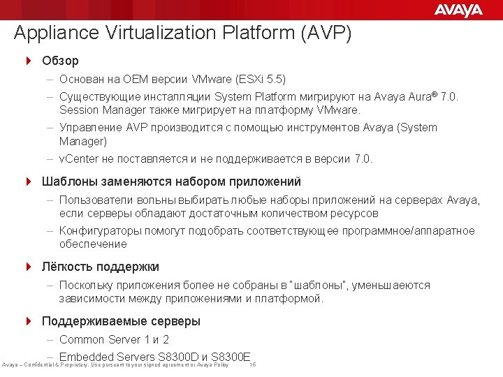 Виртуализация в модели Appliance model Определение: Термин «appliance» описывает ситуацию, в которой Avaya поставляет сервер, гипервизор (VMware) и приложения. 4 Гипервизор System Platform заменяется основанным на VMware продуктом: Appliance Virtualization Platform (AVP) Utility Services with Services Port VM App A App B ESXi (VMware v. Sphere) Appliance Virtualization Platform Avaya Aura® 6. x с System Platform Avaya Aura® 7 Xen Hypervisor для виртуализации Гипервизор VMware Common Services (CDOM) Большая часть функциональности обеспечивается Solution Deployment Manager (компонент System Manager), или остальным функционалом System Manager Avaya – Confidential & Proprietary. Use pursuant to your signed agreement or Avaya Policy 14