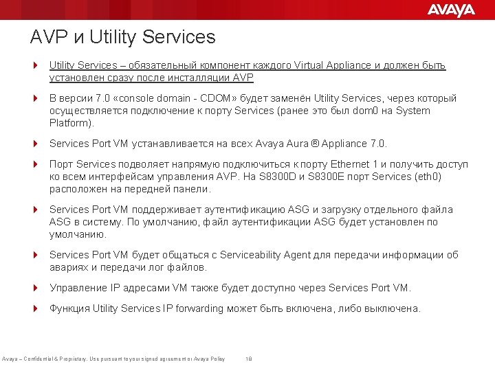 Virtual Appliance vs. Virtualized Environment Элемент Virtual Appliance Virtualized Environment Сервер: Поставляется Avaya (Common Servers are preloaded with AVP, Embedded Servers are shipped without AVP preloaded) Предоставляется заказчиком Гипервизор Поставляется Avaya: Appliance Virtualization Platform (AVP) – гипервизор, основанный на OEM версии VMware (ESXi 5. 5) Vmware, предоставляется заказчиком (ESXi 5. 0, 5. 1 or 5. 5) Лицензии VMware Включены в предложение Avaya Предоставляются заказчиком Управление Solution Deployment Manager (part of System Manager) v. Center is not required or supported with Release 7. 0 VMware v. Center Solution Deployment Manager может использоваться для внедрения и конфигурации продуктов Avaya Потребность в обучении VMware нет Сертификация VMware требуется для поддержки инфраструктуры заказчика Avaya – Confidential & Proprietary. Use pursuant to your signed agreement or Avaya Policy 16