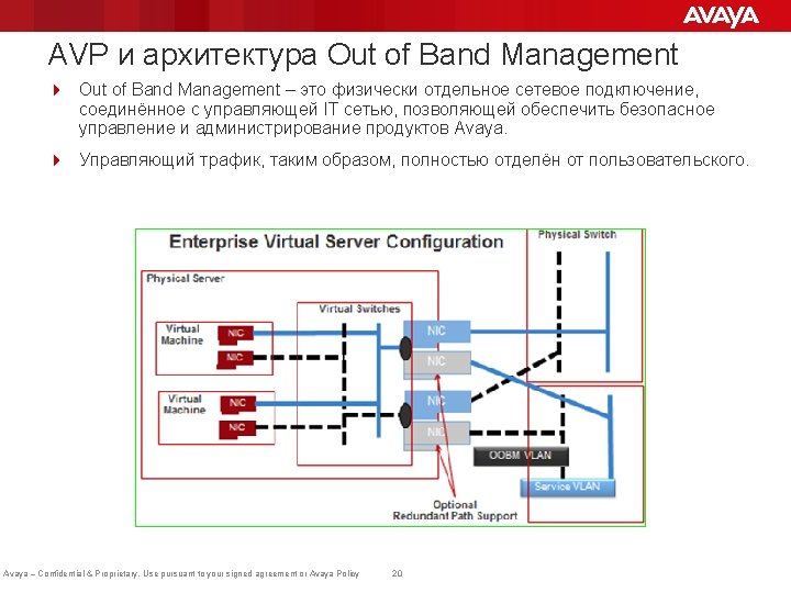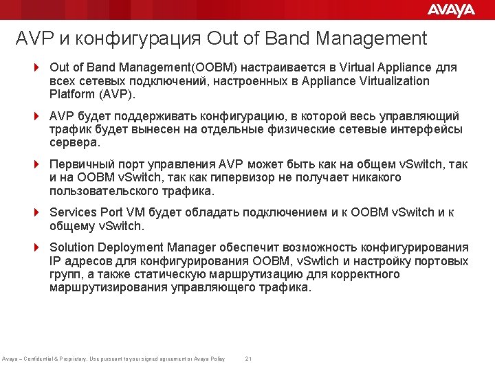 Appliance Virtualization Platform (AVP): Поддерживаемые приложения 4 Следующие поиложения будут поддерживаться Appliance Virtualization Platform (AVP) в Avaya Aura® 7. 0: – – – Session Manager (SM) Branch Session Manager (BSM) System Manager (SMGR) Application Enablement Service (AES) Utility Services (US) Communications Manager (CM) CM Messaging (CMM) Engagement Development Platform (EDP) Presence Services (устанавливается на EDP) Avaya Aura Media Server (AAMS) Web. LM ADS/SAL Avaya – Confidential & Proprietary. Use pursuant to your signed agreement or Avaya Policy 22