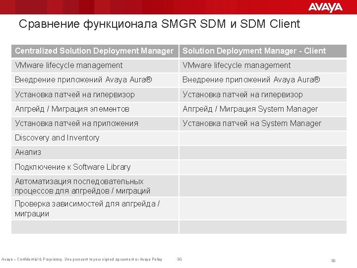 Обзор Solution Deployment Manager (SDM) 4 Solution Deployment Manager (SDM) – это сервис в System Manager (SMGR), позволяющий разворачивать новые продукты, управлять ими, устанавливать обновления на приложения Avaya Aura. 4 SMGR-SDM – это сведение воедино инструментов SMGR Software Management, Avaya Virtual Appliance Manager (AVAM) и механизмов управления System Platform. 4 SMGR с встроенным SDM – главный инструмент управления Avaya Aura® 7. 0. SMGR-SDM 7. 0 AVP Session Manager 7. 0 4 System Manager – обязательное требование в Avaya Aura® 7. 0 Communication Manager 7. 0 28 RH Linux AES 7. 0 SP Session Manager 6. 3 Communication Manager 6. 3 AVP Avaya – Confidential & Proprietary. Use pursuant to your signed agreement or Avaya Policy AVP Avaya Aura Core