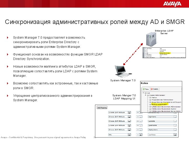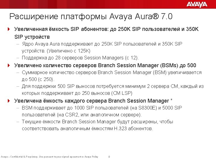 Платформа Avaya Aura® Communicator System Manager Portfolio Avaya Scopia® Desktop and Mobile Clients Applications Avaya Aura Presence Services Avaya Aura Messaging Avaya Aura Contact Center Avaya Aura Experience Portal Avaya Aura® Session Manager Applications and Snap-Ins Avaya Engagement Development Platform Avaya Session Boarder Controller for Enterprise SIP PSTN Trunks TDM Trunks Avaya Aura Conferencing AES Avaya SIP endpoints 3 rd Party PBXs Aura® Avaya for Survivable Remote Avaya – Confidential & Proprietary. Use pursuant to your signed agreement or Avaya Policy Avaya CS 1000 Avaya Aura® Communication Manager Avaya G Series Gateway Avaya Aura® Media Server NEW! 8