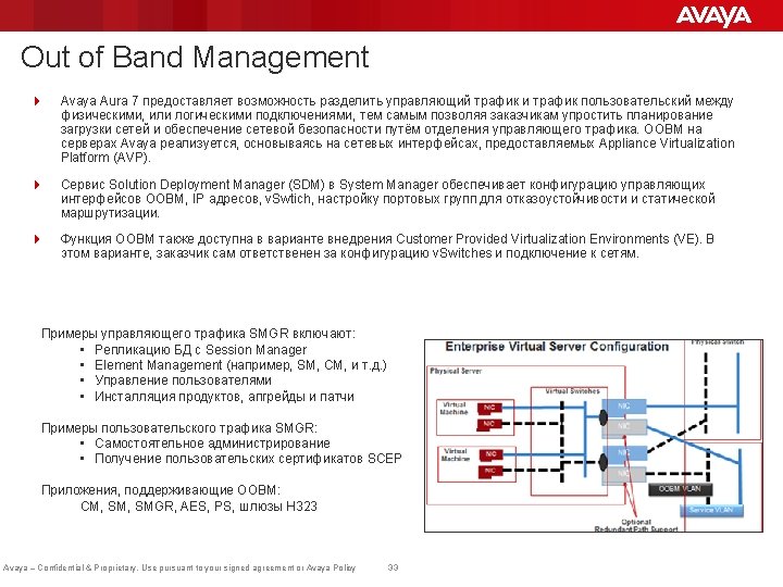 Продукты, поддерживаемые SMGR-SDM 4 Поддерживается установка приложений и в VE и в Virtual Appliance моделях. Следующий список перечисляет приложения Avaya Aura® 7. 0, поддерживаемые SMGR 7. 0 – – – Session Manager (SM) Branch Session Manager (BSM) System Manager (SMGR) Application Enablement Service (AES) Utility Services (US) Communications Manager (CM) CM Messaging (CMM) Engagement Development Platform (EDP) (включая Presence) Avaya Aura Media Server (AAMS) Web. LM ADS/SAL Avaya Aura Messaging (AAM) Внимание: Установка System Manager проводится из SDM-Client Avaya – Confidential & Proprietary. Use pursuant to your signed agreement or Avaya Policy 29