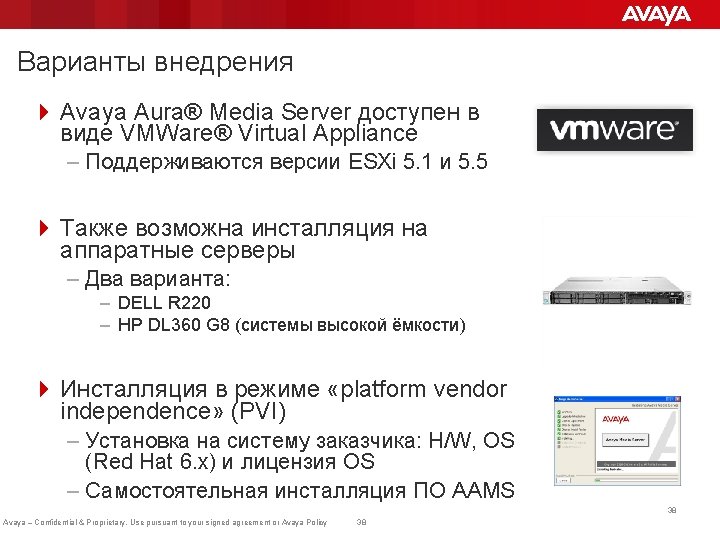 Уменьшение Footprint AAMS G 450 1 U Server, up to 4000 AAMS channels 13 G 450 Gateways (39 U Rackspace) - 4160 channels Avaya – Confidential & Proprietary. Use pursuant to your signed agreement or Avaya Policy 37