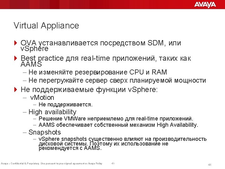 Media Processing Unit (MPU) 4 Унифицированная единица измерения потребляемой мощности сервера Avaya – Confidential & Proprietary. Use pursuant to your signed agreement or Avaya Policy 40 40