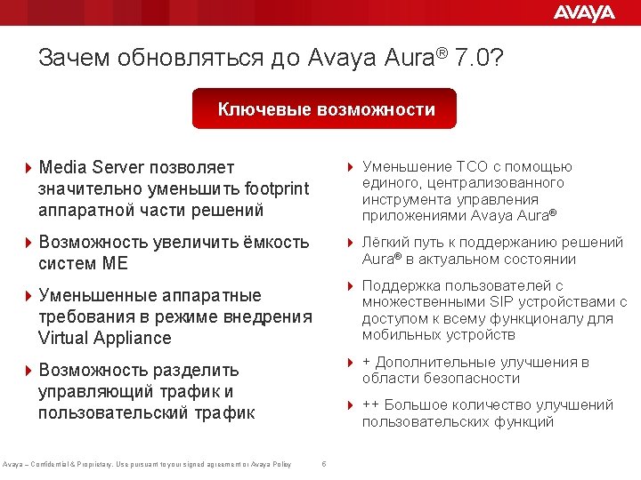 Повестка дня: 4 Обзор Avaya Aura ® 7. 0 4 Ёмкости систем Avaya Aura ® 7. 0 4 Avaya Aura ® Appliance Virtualization Platform 4 Эволюция Midsize Enterprise в Avaya Aura ® 7. 0 4 Avaya Aura ® System Manager 7. 0 4 Avaya Aura ® Media Server 7. 7 4 Avaya Aura ® Communication Manager 4 Avaya Aura ® Session Manager 4 Avaya Aura ® Presence Services Avaya – Confidential & Proprietary. Use pursuant to your signed agreement or Avaya Policy 3