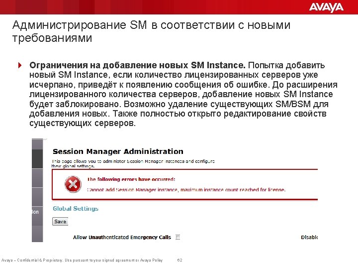Мониторинг статуса лицензий в SMGR 4 Добавлена новая колонка "License Mode". Avaya – Confidential & Proprietary. Use pursuant to your signed agreement or Avaya Policy 60