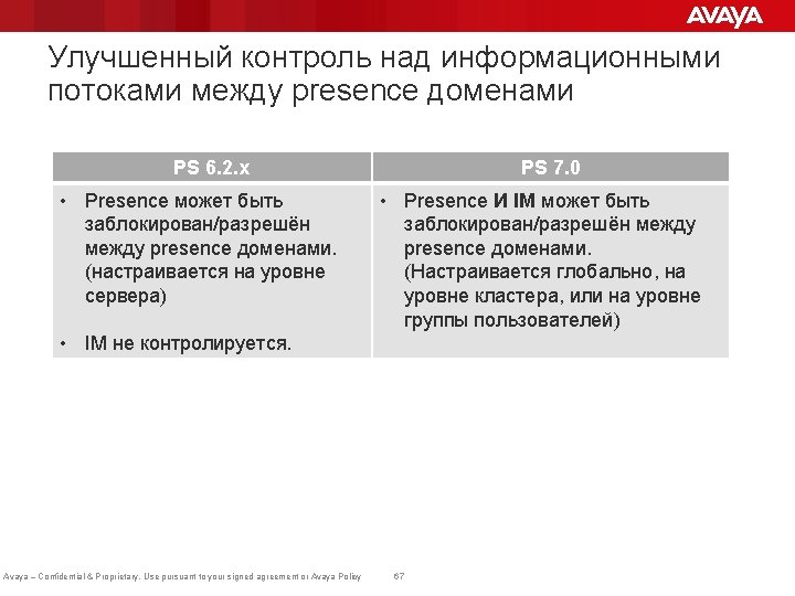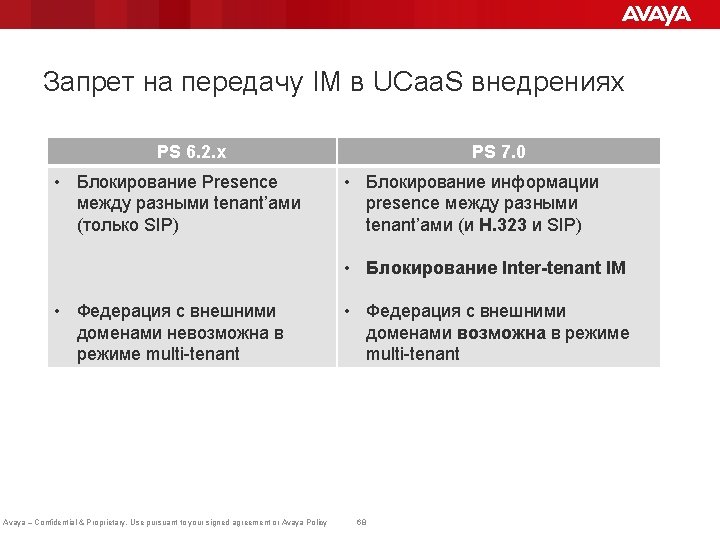 Масштабируемость Avaya Aura ® 7. 0 PS Up to 16 K Users EDP-1 125 K Users EDP-1 EDP-2 No HA 1+1 HA EDP-1 EDP-2 EDP-3 EDP-4 EDP-5 EDP-6 EDP-7 EDP-8 EDP-9 No HA N+1 HA 250 K Users N+1 HA No HA EDP-1 EDP-2 EDP-3 EDP-4 EDP-5 EDP-9 EDP-10 EDP-11 EDP-12 EDP-13 EDP-6 EDP-14 EDP-7 EDP-8 EDP-15 EDP-16 EDP-7 EDP-8 EDP-17 EDP-15 EDP-16 EDP-18 Cluster A Cluster B Avaya – Confidential & Proprietary. Use pursuant to your signed agreement or Avaya Policy Cluster A 69 Cluster B