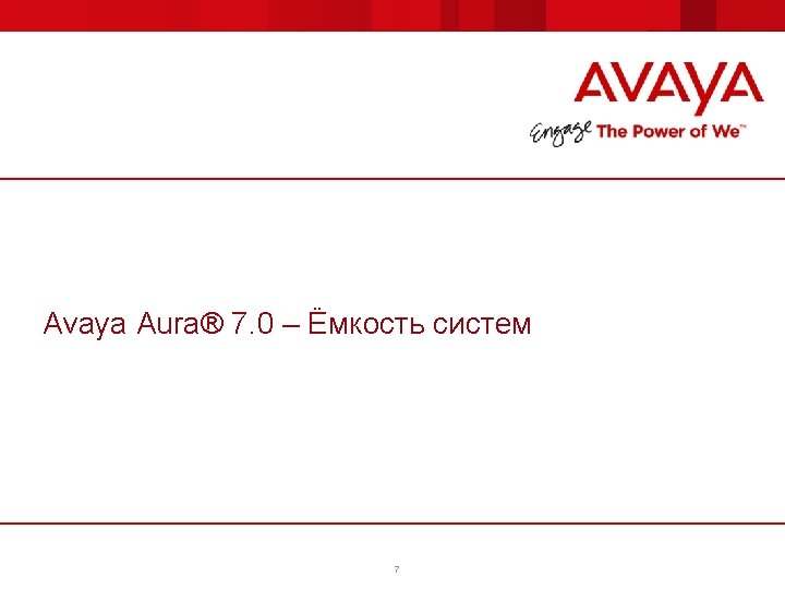 Avaya Aura® 7. 0 4 Продукты/Приложения, включённые в Avaya Aura® 7. 0 Product/Application Session Manager (SM) Communication Manager (CM) Branch Gateways (BGW) Presence Services (PS) System Manager (SMGR) (including Solution Deployment Manager) Utility Services (US) Application Enablement Services (AES) Appliance Virtualization Platform (AVP) Media Server Web. LM Business Commitment Завершено Beta Trial 11 мая 2015 Avaya – Confidential & Proprietary. Use pursuant to your signed agreement or Avaya Policy 6 Release 7. 0 7. 7 7. 0 General Availability Планируется 24 августа 2015