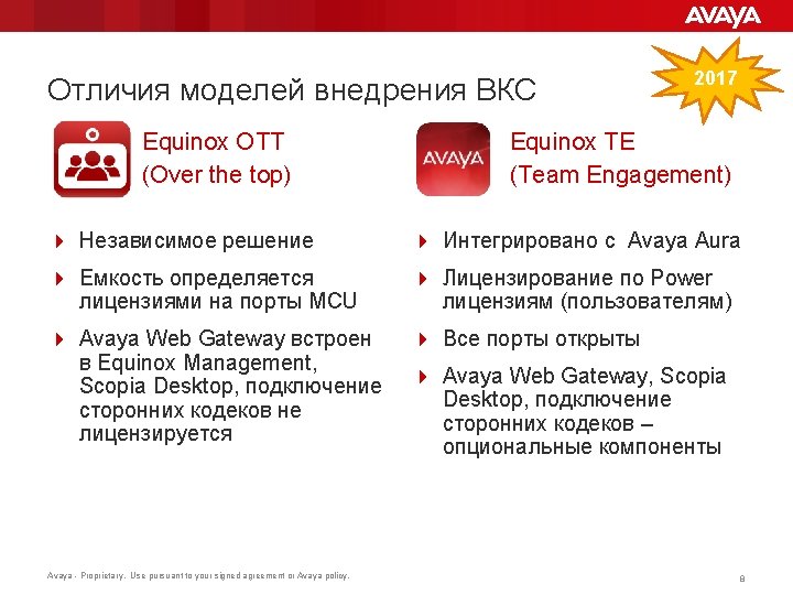 Два режима работы и возможности Avaya Equinox Media Server # Ports Audio, Video, Web Collab, Web. RTC High Capacity Audio + Web Collab H. 264 1080 p 30 / VP 8 720 p 30 H. 264 720 p 30 / VP 8 480 p 30 H. 264 480 p 30 Audio Web Collab 4 20 40 80 2, 000 3 15 30 60 1, 500 2 10 20 40 1, 000 1 5 10 20 500 # Licenses Для модели TE EQUINOX MANAGEMENT EQUINOX MEDIA SERVER Full Audio, Video, Web Collab, Web. RTC Avaya - Proprietary. Use pursuant to your signed agreement or Avaya policy. EQUINOX MEDIA SERVER High Capacity Audio + Web Collab 9