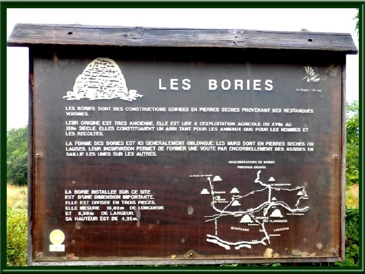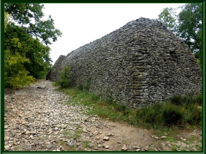 Sans aller jusqu’au village de La Roque-sur-Pernes, nous allons découvrir de spectaculaires bories, spectaculaires par leur taille… Le terme borie, dans la langue touristique relative à la Provence, désigne une cabane en pierre sèche ayant servi de grange, d'écurie ou d'habitation saisonnière à un agriculteur du XIXe siècle dans une parcelle foraine (sur une autre commune) ou trop éloignée de sa ferme. Pour ces constructions, intervient la technique de l’encorbellement : des pierres plates, soit brutes, soit parfois retaillées, sont posées à plat l'une sur l'autre et légèrement inclinées vers l'extérieur de la construction, chacune s'avançant un peu vers l'intérieur par rapport à la précédente. Cette technique, supprimant la nécessité d'un cintre en bois, était à la portée des paysans auto-constructeurs s'ils disposaient des dizaines de tonnes de pierres nécessaires à ce type d'ouvrage, de préférence à proximité.