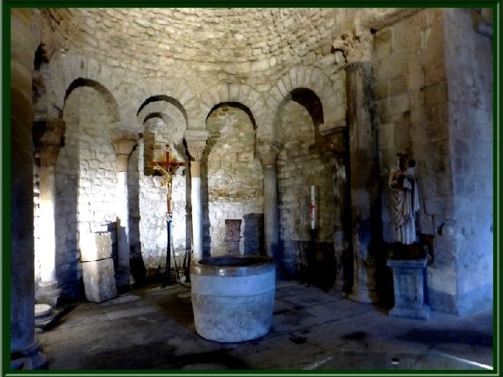 « A cette époque, les catéchumènes, c’est-à-dire les adultes qui demandent le baptême et s’y préparent sont nombreux. Seul l’évêque, et plus tard son délégué, célèbrent le baptême une fois par an. Il faut donc un édifice assez grand pour de telles célébrations. Elles ont lieu le soir, les veilles de Pâques et de Pentecôte… … La cuve pouvait être recouverte de mosaïques et comportait huit côtés. Le nombre huit est symbolique de la Résurrection du Christ , le dimanche de Pâques. Il vient après les sept jours de la création. Considéré comme le huitième jour, ce dimanche de Pâques évoque le début de la nouvelle création Le baptisé qui descend dans la cuve est « plongé » (c’est le sens du mot baptisé) dans la mort du Christ pour ressusciter avec Lui à une vie nouvelle, lorsqu’il remonte de la piscine baptismale. Les quatre absides remaniées à partir du XIe siècle présentent les caractéristiques primitives du baptistère, lieu du salut spirituel de l’homme. Les six colonnes soutiennent cinq arcs, les cinq sens et ceci vers les quatre directions de la terre qui sont en même temps les bras de la Croix. » (Feuillet explicatif sur le baptistère)