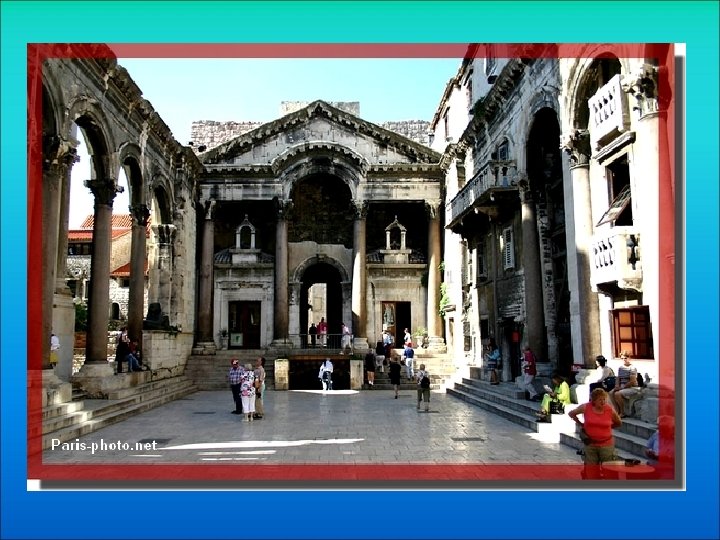 Le palais de Dioclétien mesurait environ 215 par 180 m. Il était entouré d’un mur puissant avec des tours carrées fortifiées aux quatre angles. Chacune des quatre murailles était percée d’une porte en son centre. C’étaient la porte de l’or, celle de l’argent, celle du fer et celle du bronze. Elles sont relativement bien préservées. Nous entrons par la porte de bronze qui, autrefois, ouvrait directement sur la mer. Elle donne accès aux appartements de l’empereur, par les sous-sol communément appelés « souterrains de Dioclétien » . En fait, c’était une structure pour supporter les appartements de l’étage. Le terrain étant en pente en direction de la mer, elle avait pour but de niveler le palais. Un escalier conduit directement au péristyle, une cour à ciel ouvert, le cœur de l’ensemble. Cette ville est inscrite, elle aussi, au patrimoine Mondial de l’Unesco, pour son palais de Dioclétien, mais aussi pour sa cathédrale.