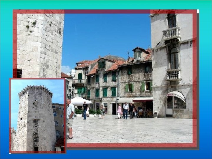 A droite, le mausolée octogonal transformé en cathédrale, l’une des plus petites au monde. Au XIIIe siècle, on lui a adjoint un grand clocher de style roman tardif. Ses étages supérieurs ont été ajoutés au XIXe siècle. Haut de 50 m, il se voit de très loin et il est devenu le symbole de la ville. La cathédrale abrite les autels des saints martyrs de Solin mais on l’a vite nommée église Saint. Domnius du nom du premier évêque de Split qui fut martyrisé.