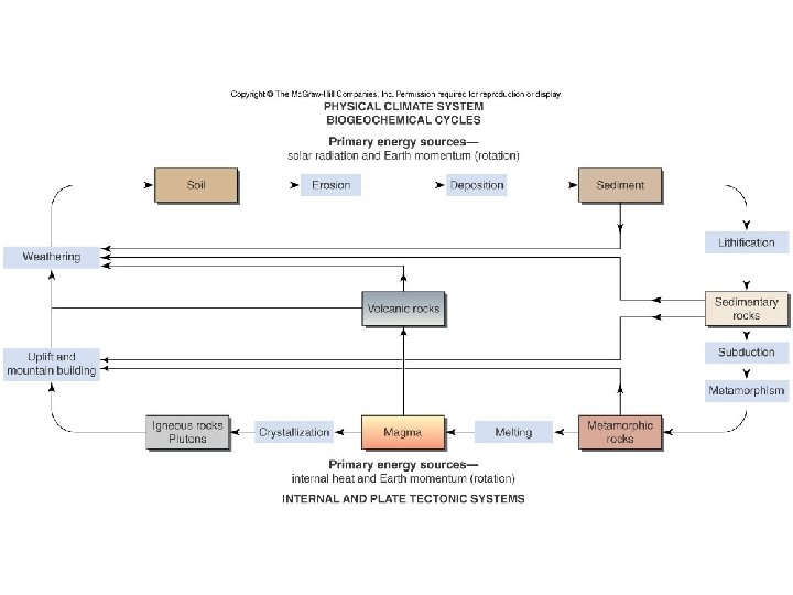 In Conclusion… • The rock cycle demonstrates the relationships among the three major rock groups • It is powered by the interior heat of the Earth • As well as earth’s momentum and… • The energy from the sun • It involves processes on the Earth’s surface as well as the Earth’s interior • It connects the “hydrologic cycle” with the “tectonic cycle”.