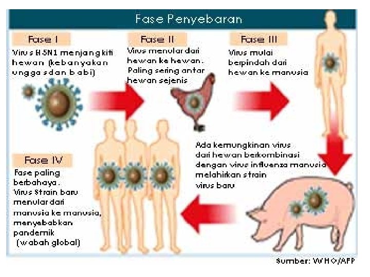PENYEBARANNYA • Burung-burung yang terinfeksi menyebarkan virusnya di air liur, cairan saluran pernafasan, dan kotorannya. Virus flu burung menyebar diantara burung-burung yang rentan saat mereka terkena kotoran yang telah terkontaminasi. • Sebagian besar kasus infeksi H 5 N 1 pada manusia disebabkan oleh kontak dengan unggas yang telah terinfeksi atau lingkungan yang telah terkontaminasi.