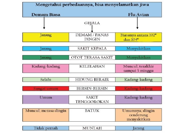 GEJALA KILINIK • Masa inkubasi virus avian influenza A (H 5 N 1) sekitar 2 - 4 hari setelah terinfeksi (Yuen KY, et. al. 1998), bisa mencapai antara 4 -8 hari(Chotpitayasunondh T, et. al. 2005). • Gejala awal berupa demam tinggi (biasanya lebih dari 38 o C) dan gejala flu serta. Gejala lain dapat timbul adalah diare, muntah, sakit perut, sakit pada dada, hipotensi, dan perdarahan dari hidung dan gusi. Gejala sesak nafas mulai terjadi setelah 1 minggu berikutnya.