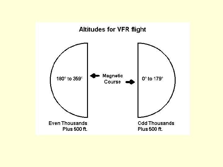 When operating below 18, 000 feet MSL in VFR cruising flight more than 3, 000 feet above the surface and on a magnetic course of 0° through 179°, any odd thousand-foot MSL altitude plus 500 feet (3, 500, 5, 500, etc. ) is appropriate. On a course of 180° through 359°, even thousands plus 500 feet (4, 500, 6, 500, etc. ) is appropriate. (B 09) 14 CFR § 91. 159