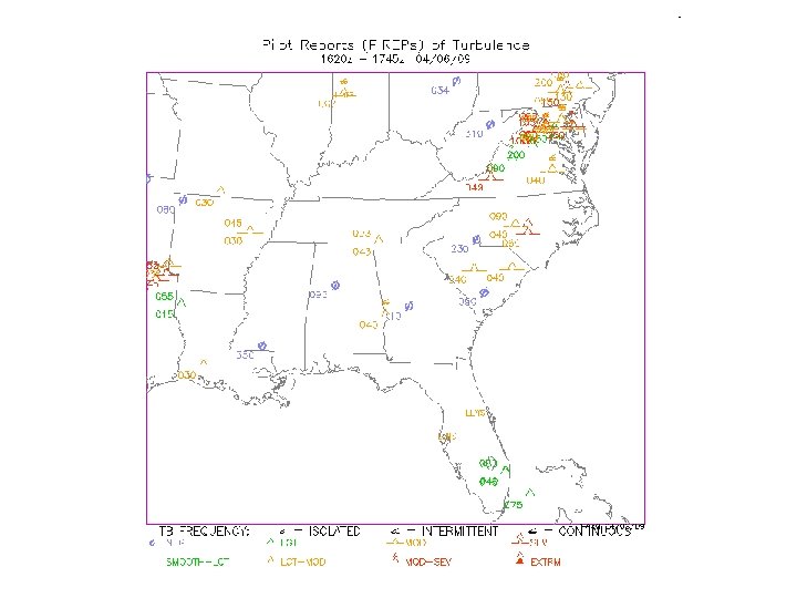 Graphical Turbulence Guidance (GTG) • Developed by National Center for Atmospheric Research (NCAR) • Uses RUC (Rapid Update Cycle) 20 km grids and observations of turbulence/lightning • Combines 11 different turbulence forecasting tools through a weighting function • Produces upper-level clear-air turbulence (CAT) prediction • Output is a number from 0 -1