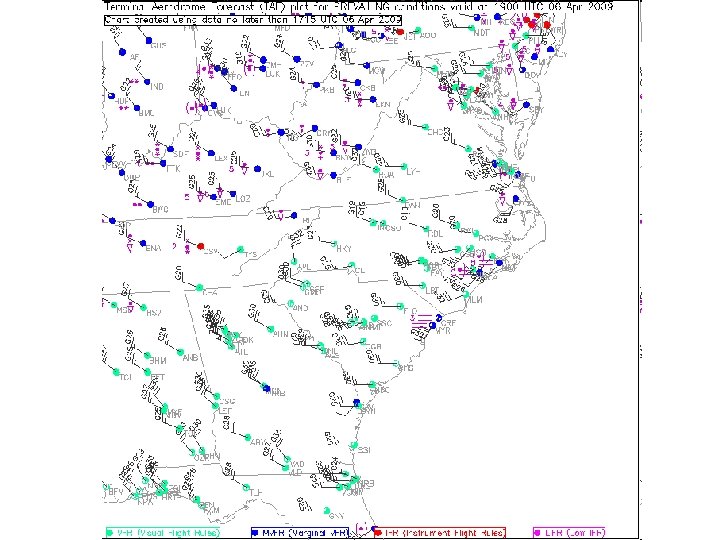 Terminal Aviation (Aerodrome) Forecasts (TAFs) • Surface forecast for hundreds of airport terminals around the country – Use METAR code – Produced by a human (not always at the reporting site) – Can be more accurate than NWP models • Local effects