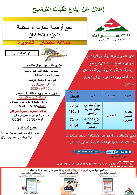AVIS DE DEPOT DES DEMANDES DE CANDIDATURE LOTISSEMENT AL HANCHANE LOTS DE TERRAIN «HABITAT & COMMERCIAL » COMMUNE AL HANCHANE - ESSAOUIRA Al Omrane Marrakech-Safi met en vente par voie de dépôt LOTISSEMENT AL HANCHAN de dossiers de Candidature des lots de terrain HABITATS & COMMERCIALS au lotissement Le dossier de candidature se compose de : AL HANCHANE, et ce comme suit : localité Lotissement Type de produit Superficie à proximité m 2 LOTS DE TERRAIN R+2 A RDC COMMERCIAL ESSAOUIRA AL HANCHANE • Photocopie de la C. I. N du candidat • Formulaire d’acquisition LOTS DE TERRAIN R+2 A RDC HABITAT Les personnes intéressées sont priées de De 72 à 120 De 72 à 73 délai de dépôt des dossiers : DU 01 Octobre 2020 AU 15 octobre 2020 Lieu de retrait et de dépôt des dossiers : *Agence Commerciale Essaouira Centre Commercial-Bin Al Aswar Essaouira Tél. 05 24 78 51 55 * l’Agence Commerciale Régionale de Marrakech Sise au siège de la Société Place du 16 Novembre - Guéliz Marrakech. Tél. : 05 24 44 78 38 retirer les formulaires d’acquisition des Agences Commerciales citées ci-contre. www. alomrane. gov. ma Prix d´une communication locale AL OMRANE Marrakech-safi , Bd Med V, place du 16 novembre-Guéliz-Marrakech Tél: 05 24 44 78 38 / Fax : 05 24 44 62 18 AL OMRANE Marrakech-safi est une filiale du Groupe Al Omrane. La commission de sélection des dossiers le 19 Octobre 2020 sera tenue au siège de la société en présence d’un notaire.