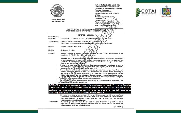 • Sexagésimo primero. En la parte del documento donde se hubiese ubicado originalmente el texto eliminado, deberá insertarse un cuadro de texto en color distinto al utilizado en el resto del documento con la palabra "Eliminado", el tipo de dato o información cancelado y señalarse si la omisión es una palabra(s), renglón(es) o párrafo(s). • En el cuadro de texto mencionado en el párrafo anterior, deberá señalarse el fundamento legal de la clasificación, incluyendo las siglas del o los ordenamientos jurídicos, artículo, fracción y párrafo que fundan la eliminación respectiva, así como la motivación de la clasificación y, por tanto, de la eliminación respectiva. • En caso de que el documento, se hubiere solicitado impreso, se realizará la impresión respectiva.