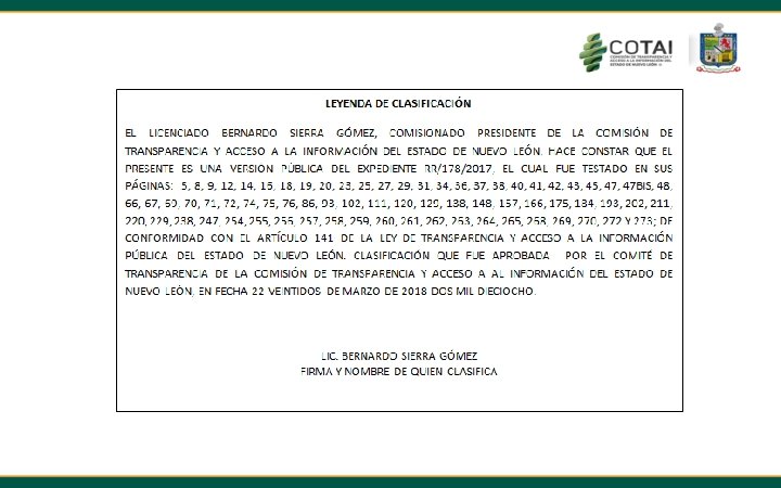 1 • Citar artículo y fracción de la LGTAIP, LTAIPNL y Lineamientos 2 3 • Identificar el daño que se ocasiona al bien jurídico protegido por la reserva. • Describir los elementos del riesgo que conlleva la difusión de la información al bien tutelado. 1. 2. 3. Real/presente Demostrable / probable Identificable / específico.
