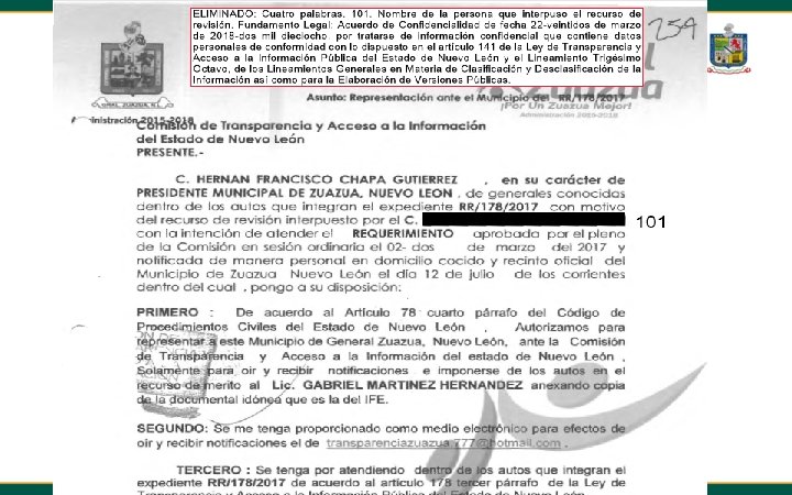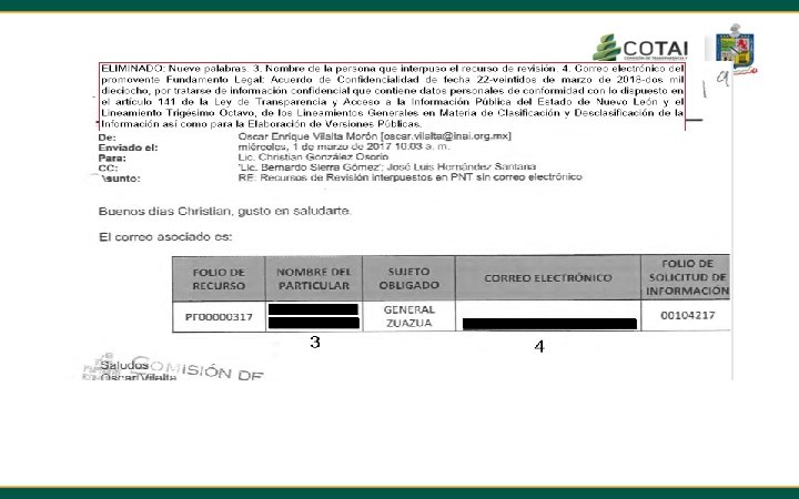 1 2 3 4 5 6 Eliminado: 12 palabras. 1. Nombre de un particular; 2. Correo electrónico personal de un particular; 3. Nombre de un particular; 4. Teléfono personal de un particular; 5. Correo electrónico personal de un particular; 6. Dirección personal de un particular. Fundamento legal: Acuerdo de confidencialidad de fecha 13 de marzo de 2018, por tratárse de información confidencial que contiene datos personales de conformidad con lo dispuesto en el artículo 3, fracción XVI y 141 de la Ley de Transparencia y Acceso a la Información Pública del Estado de Nuevo León.