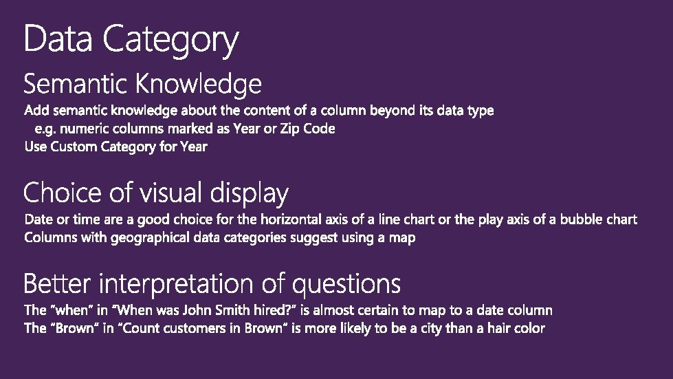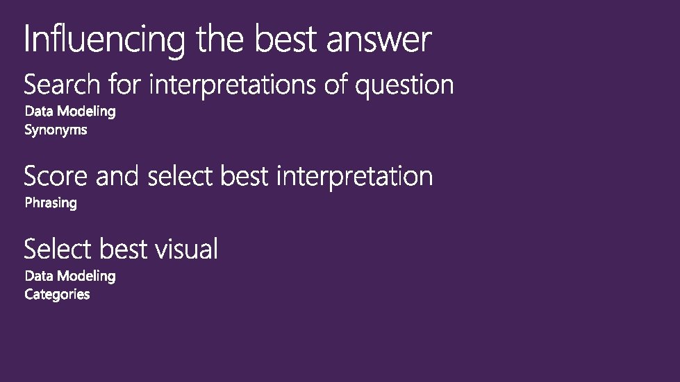 Search for interpretations of question Score and select best interpretation Content Display Show 1 measure, 1 member (geo) Map Show 2 measures, 1 member Scatter Show 1 measure, 1 member Bar Select best visual