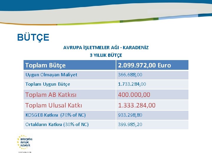 BÜTÇE AVRUPA İŞLETMELER AĞI - KARADENİZ 3 YILLIK BÜTÇE Toplam Bütçe 2. 099. 972, 00 Euro Uygun Olmayan Maliyet 366. 688, 00 Toplam Uygun Bütçe 1. 733. 284, 00 Toplam AB Katkısı 400. 000, 00 Toplam Ulusal Katkı 1. 333. 284, 00 KOSGEB Katkısı (70% of NC) 933. 298, 80 Ortakların Katkısı (30% of NC) 399. 985, 20