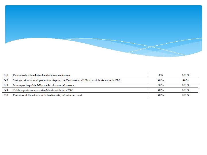 Obiettivo strategico 2 «Un'Europa più verde e a basse emissioni di carbonio attraverso la promozione di una transizione verso un'energia pulita ed equa, di investimenti verdi e blu, dell'economia circolare, dell'adattamento ai cambiamenti climatici e della gestione e prevenzione dei rischi» OBIETTIVI SPECIFICI i) promuovere misure di efficienza energetica; ii) promuovere le energie rinnovabili; ALLEGATO D DELLA RELAZIONE PER PAESE RELATIVA ALL’ITALIA 2019 ●promuovere l'efficienza energetica mediante la ristrutturazione degli alloggi sociali e degli edifici pubblici, dando priorità alle ristrutturazioni radicali, alle tecnologie innovative e alle prassi e agli standard più avanzati; ●promuovere le tecnologie rinnovabili innovative e meno mature, in particolare per il riscaldamento e il raffreddamento, negli edifici pubblici, nell'edilizia sociale e nei processi industriali nelle piccole e medie imprese