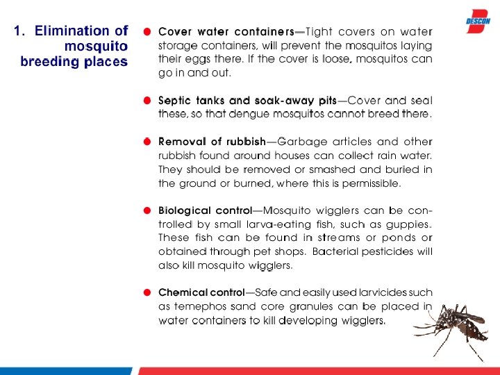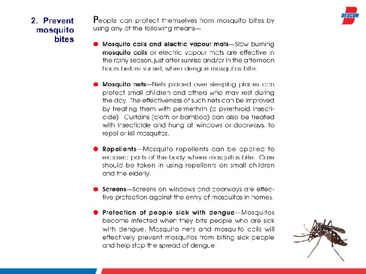Preventions • Keep your homes and offices protected against mosquitoes. • Keep homes and offices airy, bright and safe from moisture. • Fix nets on doors and windows. • Wear full sleeves clothes. • Use mosquito nets while sleeping. • Don't leave the overhead tanks open & avoid using swimming pools. • Don't keep water in containers for more than a week. Instead, empty them every week, let them dry and then fill again. • Don't let the water falling from the overhead tanks to accumulate permanently. Instead dry it. • Don't let the water accumulate in any case both inside or outside the home. • Be mindful of your home's cleanliness. • Keep the fence and hedge boundaries duly cut both inside and outside the home, and spray over them with insecticides, particularly in the evening. • Don't let the water stay all the time in the flower pots, gamias of plants. Instead water them only in the morning every alternate day. • The best way to fight dengue is through sustained cleanliness and sanitation.