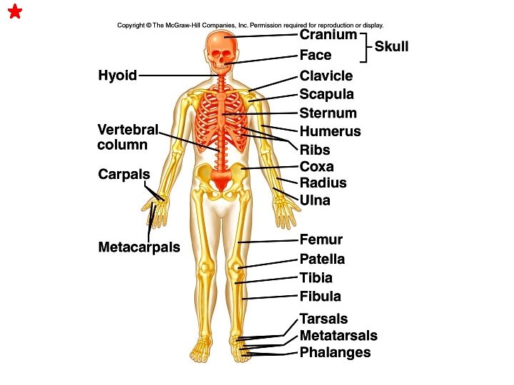 Axial Skeleton Axial skeleton supports and protects organs of head, neck and trunk Axial skeleton: • Skull (cranium and facial bones) • Hyoid bone (anchors tongue and muscles associated with swallowing) • Vertebral column (vertebrae and disks) • Bony thorax (ribs and sternum)
