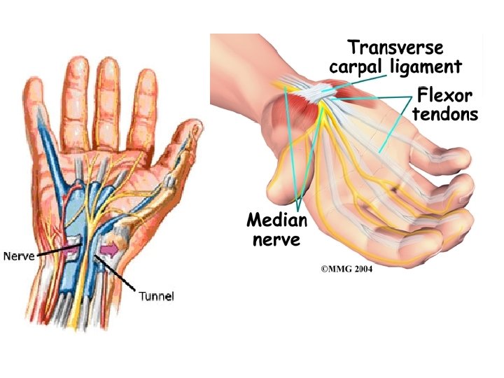 Carpal Tunnel Syndrome • Any condition that causes swelling or a change in position of the tissue within the carpal tunnel can squeeze and irritate the median nerve. Irritation of the median nerve in this manner causes tingling and numbness of the thumb, index, and the middle fingers, a condition known as "carpal tunnel syndrome. "