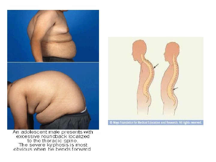 Kyphosis • With kyphosis, your spine may look normal or you may develop a hump. Kyphosis can occur as a result of developmental problems; degenerative diseases, such as arthritis of the spine; osteoporosis with compression fractures of the vertebrae; or trauma to the spine. It can affect children, adolescents and adults.